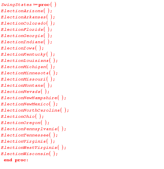 As in the last section, if polling data has changed significantly since this calculator was written, you can edit this list to suit your needs.You should delete any state that you have declared to be a "safe" state in the above section. To write in new competitive states, type in "ElectionState();", replacing "State" with the appropriate full state name. For the District of Columbia, you would type "ElectionDC();". This list should include only the states not listed in the "Safe States" section. Make sure each state and D.C. is listed exactly once between these two sections.
