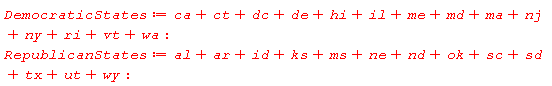 This version of the Election Calculator assumes two lists of "safe" states that are known to be strongly skewed towards either Democratic or Republican candidates based on their state demographics and voting patterns. It is extremely unlikely that these states would vote for the opposing party. This version of the calculator automatically gives the electoral votes of the "safe" states to the appropriate side, in order to speed up the computation. To read the coding, DemocraticStates lists all the states considered to be strongly Democratic, while RepublicanStates lists those states considered to be strongly Republican.