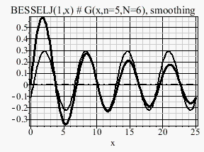 p[2]:=plot(G(x,n=5,N=6),x=0..8*Pi,th=2,co=black, title="BESSELJ(1,x) # G(x,n=5,N=6), smoothing"):