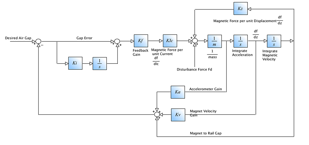 Maple is used to create, from first principles, a linear model of the new system and develop the control system, including both acceleration feedback and a PID controller. The acceleration feedback allows the air gap to be increased or decreased according to disturbances, so that there is no unwanted response. This results in a smoother and more comfortable ride.