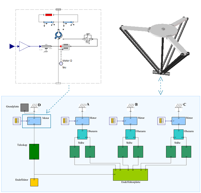 Figure 1 - Modeling the B&R motors, and full delta robot in MapleSim