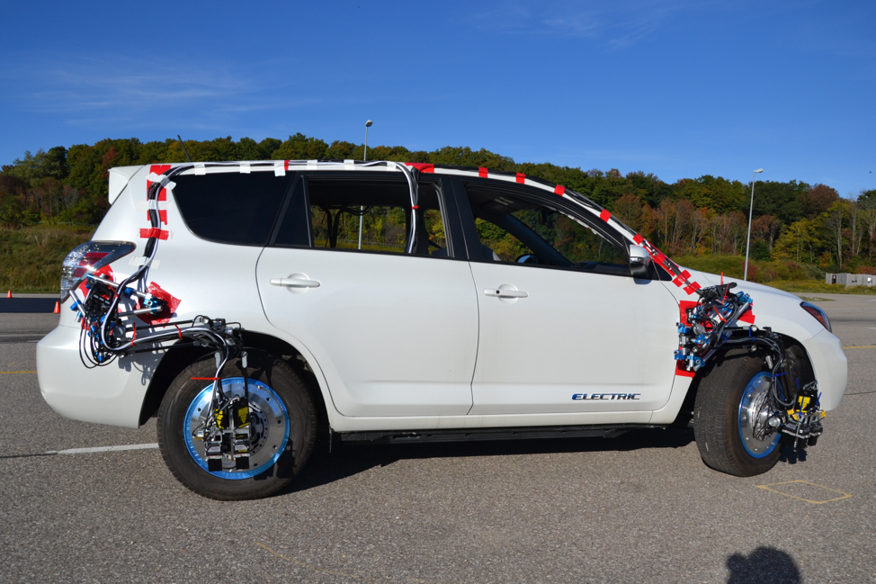 The research team, led by Dr. John McPhee, Professor of Systems Design Engineering, and Dr. Joydeep Banerjee, Lead Researcher, used Maplesoft’s system-leveling modeling tool, MapleSim, to develop and test a volumetric tire model. “The volumetric tire model developed in MapleSim offers two distinct advantages over existing tire models,” said Dr. Banerjee. “Since the moments are calculated using kinematic data only, the model can be easily programmed for numerical simulations. In addition, the resistive torques are evaluated as functions of both normal load and angular speed of the wheel.”