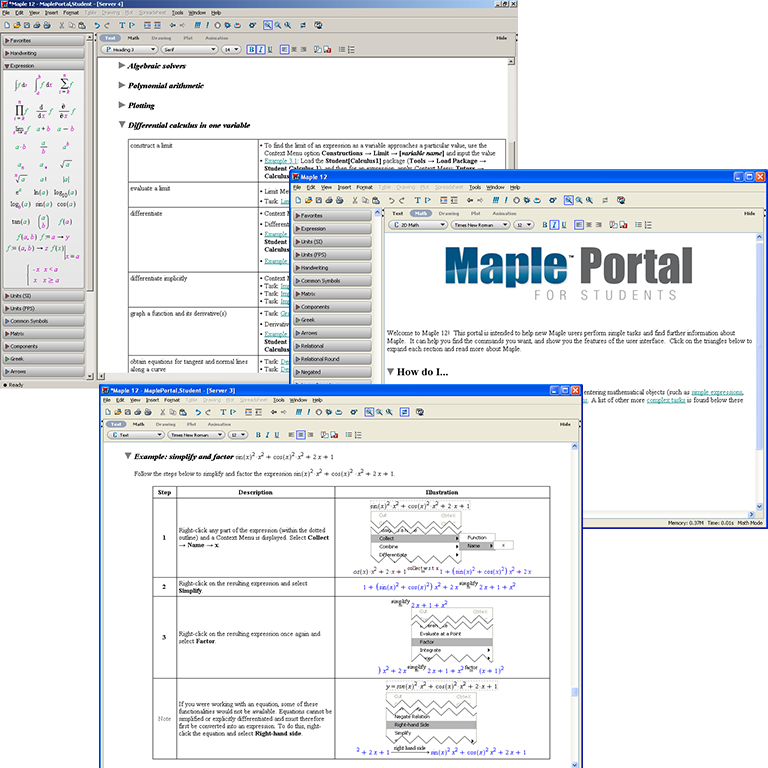 The Maple Portal for Students acts as a starting point for hundreds of common tasks from mathematics courses, and anticipates the question "How do I ..." in Maple.