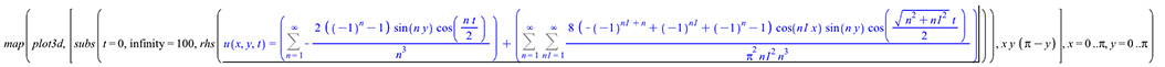 > map(plot3d, [subs(t = 0, infinity = 100, rhs(u(x, y, t) = Sum(Sum(`+`(`-`(`/`(`*`(16, `*`(`+`(`-`(`^`(-1, `+`(n1, n))), `^`(-1, n1), `^`(-1, n), `-`(1)), `*`(sin(`*`(n, `*`(Pi, `*`(x)))), `*`(sin(`*`(...