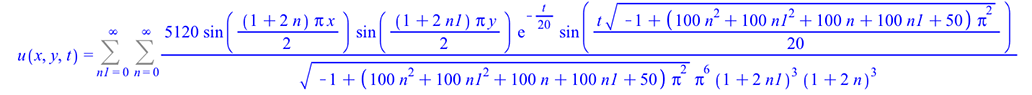 u(x, y, t) = Sum(Sum(`+`(`/`(`*`(5120, `*`(sin(`+`(`*`(`/`(1, 2), `*`(`+`(1, `*`(2, `*`(n))), `*`(Pi, `*`(x)))))), `*`(sin(`+`(`*`(`/`(1, 2), `*`(`+`(1, `*`(2, `*`(n1))), `*`(Pi, `*`(y)))))), `*`(exp(...