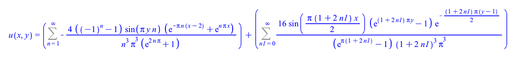 u(x, y) = `+`(Sum(`+`(`-`(`/`(`*`(4, `*`(`+`(`^`(-1, n), `-`(1)), `*`(sin(`*`(Pi, `*`(y, `*`(n)))), `*`(`+`(exp(`+`(`-`(`*`(Pi, `*`(n, `*`(`+`(x, `-`(2)))))))), exp(`*`(n, `*`(Pi, `*`(x))))))))), `*`(...
