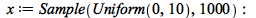 In this example, we have 1000 data points. There is a single independent variable, x, with values uniformly distributed between 0 and 10. The dependent variable is a linear function of the independent variable plus some additive noise, y=5 x + 10 + noise, where the noise is from a probability distribution known to have severe outliers - the Cauchy distribution, with location parameter 0 and scale parameter 5.