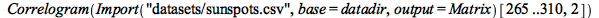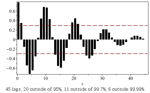 The Correlogram command computes autocorrelations of a data set and displays the result as a column plot with dashed lines indicating the lower and upper 95% confidence bands for the normal distribution N(0,1/L), where L is the size of the sample 'X', and a caption reporting how many of the displayed columns lie outside of the bands of plus or minus 2, 3, and 4 standard deviations respectively. AutoCorrelationPlot is an alias for the Correlogram command.