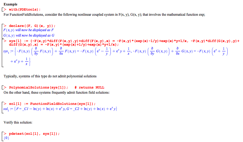 - FunctionFieldSolutions is a new command that involves an innovative approach to computing exact solutions to DE systems involving mathematical functions, possibly inequations, ODEs and also non-differential equations. In these cases, due to the presence of nonpolynomial objects, the original Maple approach was to decouple the system using differential polynomial extensions. This approach, although powerful, sometimes failed to solve the problem. The new approach in FunctionFieldSolutions skips that step entirely and instead searches for solutions that can be written as a power series (with some upper bound degree n) in the mathematical functions and its derivatives (up to some upper bound differential order m), having for coefficients multivariable polynomials (with some upper bound degree r). In turn these polynomials have undetermined coefficients that get adjusted, resulting in the solution. To compute the key values of n, m, r to construct these function field solutions, the new command maps the problem into one that can be tackled with the existing PDEtools:-Library:-UpperBounds (see PDEtools[Library]).