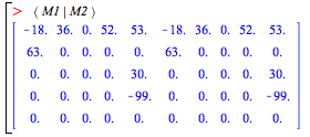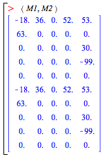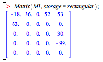 Since there is no apparent structure in this matrix, except for the fact that 90% of the entries are zero, a general sparse matrix is appropriate. There are two general formats for Array, Matrix, and Vector creation in Maple that are specified with the option storage=sparse. One format, for Arrays, Matrices, and Vectors with a non-hardware datatype, uses a hash table to store index/value pairs. Insertion and lookup are very fast, as is unordered data traversal. The other, for hardware datatypes, matches the format used by the Numerical Algorithms Group (NAG) libraries. In this format, vectors are used to store the index and column coordinates, lined up with a value vector.