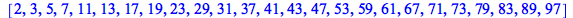 | > | [(i:=2), (while (i:= nextprime(i)) <N do i end do)] |