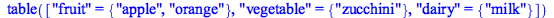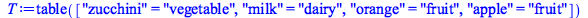 | > | T := table(["apple" = "fruit", "orange" = "fruit", "zucchini" = "vegetable", "milk" = "dairy"]) |