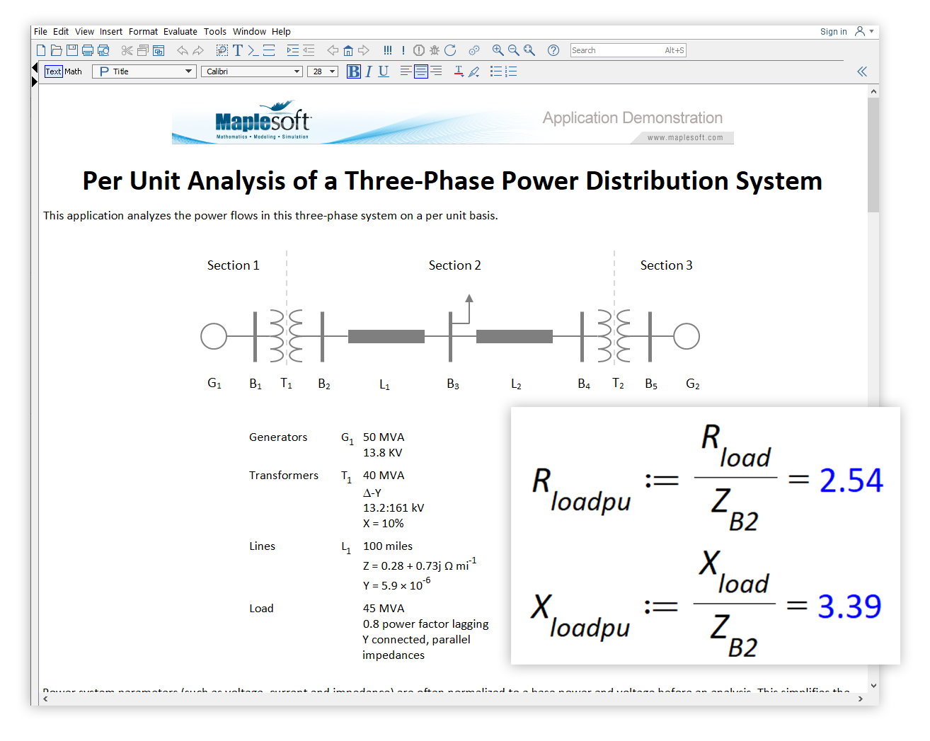 The units generally used in power systems studies are built into Maple. For example, Maple understands what volts, amps and ohms are, and correctly converts units into derived quantities. Custom units can also be defined in Maple, and are used in this application to simplify the mathematics.