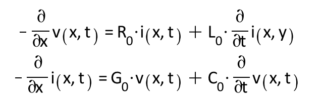 The calculations begin with a lumped parameter model of a transmission line, which can be represented as coupled, partial differential equations after applying Kirchoff’s voltage and current laws. The Laplace transforms are based on these resulting differential equations which are known as the Telegrapher’s Equations, as seen below.