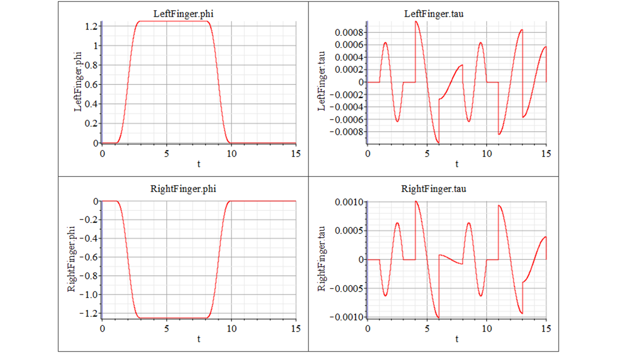 A model of a 2 DOF gripper, which utilizes two pairs of 4-bar linkage mechanisms, is built using the MapleSim CAD Toolbox to import the CAD assembly created in SolidWorks. This gripper is driven by rotational and translational position drivers from the 1-D Motion Generation app.