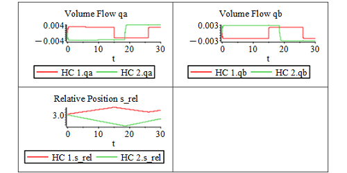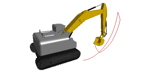 This is a model of an excavator that was created using a combination of MapleSim's Multibody and Hydraulics libraries. The movement and functions of the hydraulic excavator are accomplished through the use of differential cylinders, which are used to convert hydraulic flow into translational motion. Input signals are given to the directional valve of each hydraulic circuit to signal an extension or retraction motion. In the case of an excavator, a runaway load situation can occur when the directional valve shifts to retract or extend a hydraulic cylinder and the weight of the load forces the actuator to move faster than the pump flow. A counterbalance valve has been added to the hydraulic circuits to control this runaway load.