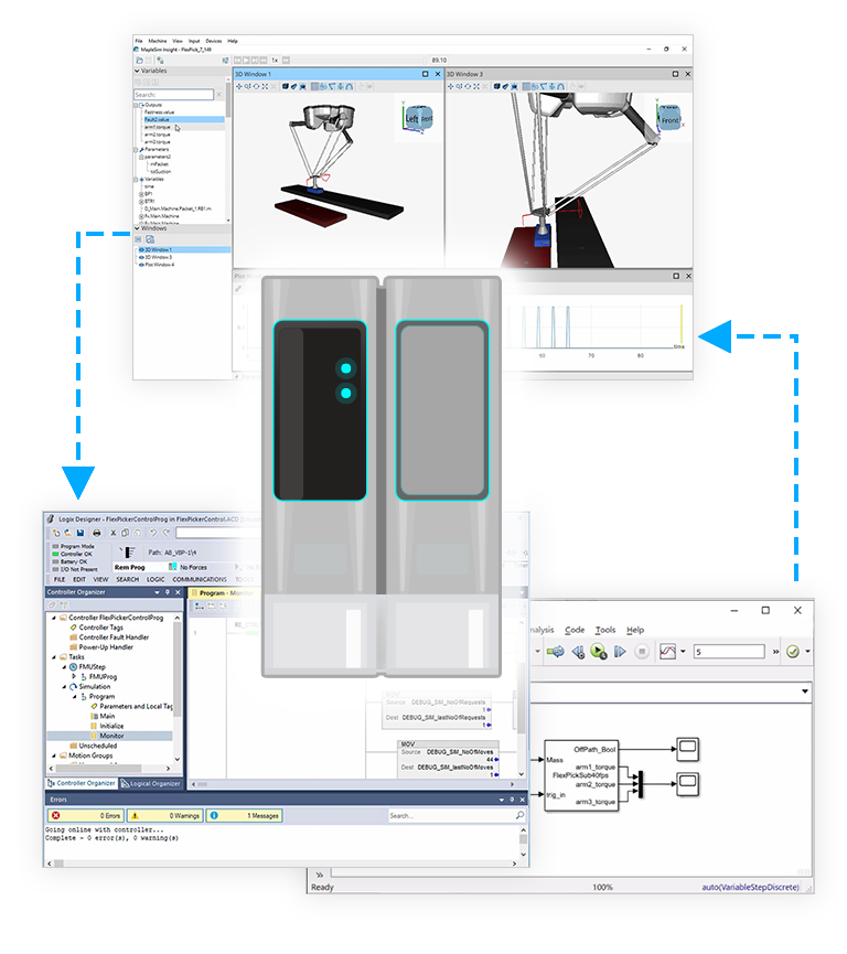 Simulation-based testing of machine control strategies is a key element of virtual prototyping and the use of digital twins for virtual commissioning. Unfortunately, this step can be cumbersome, as many automation tools provide limited options for machine-level, simulation-based controller testing, and these options often require moving development to an entirely new platform. MapleSim Insight gives machine builders powerful, simulation-based debugging and 3-D visualization capabilities that directly connect to your automation tools, so you can perform simulation-based testing of your controller easily and efficiently. MapleSim Insight provides both 3-D visualizations for quick visual feedback, and 2-D plots to get precise answers for testing and debugging, so you can always get the level of detail you need. With a real-time connection to most common automation platforms, MapleSim Insight shows you exactly how your control strategies will impact your machine - all before a physical prototype is constructed.