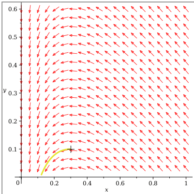 ExploreDEtoolsDEplotdeS,deI,xt,yt,                                                        t=0..40,x=0..1,y=0..0.6,                                                       x0=x0,y0=y0,arrows=medium,                   parameters=x0=0.3..0.99,y0=0.1..0.5,                   showmarkercontrols,                 markers=x0,y0,                  placement=left,                 animate