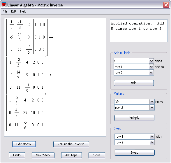 Since the determinant is non-zero, you can calculate the inverse of this Matrix. The InverseTutor command is an interactive tutor that allows you to apply an elementary row operation, request a hint, go back a step, or request the solution. After each computation, the previous and current states of the matrix are displayed, as well as text descriptions of the recently applied step.