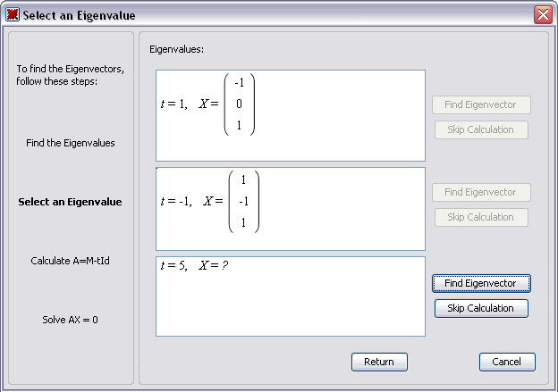 The EigenvectorsTutor takes you through the process of calculating the eigenvectors of a Matrix within a sequence of several windows.