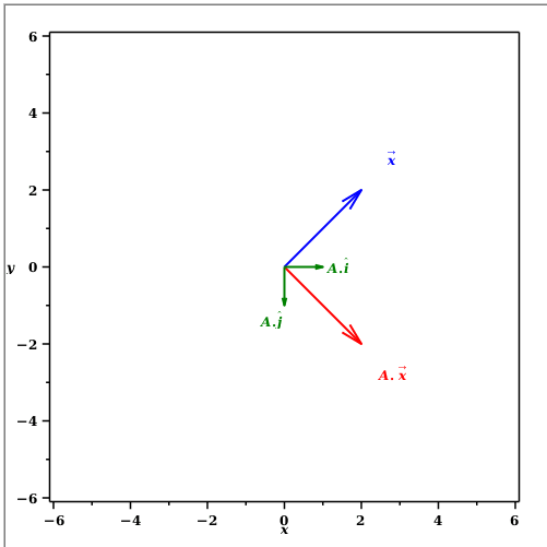 Click and/or drag on the graph to change the initial vector x→ or the transformation vectors A⋅i∧ and A⋅j∧. You can also edit the values of the transformation matrix A and the vector x→ directly.