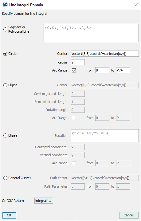In the "Line Integral Domain" dialog, select "Circle" and enter coordinates of the center and the radius. Select "Arc Range" and provide the start and end values of t. At the bottom of the dialog, select "integral" as the return option. (The alternative is "value".)