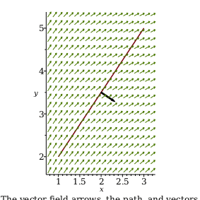 Calculate the flux of the field F=x y i+x+y j through the line from 1,2 to 3,5. Take the normal to the right of the tangent along the line.