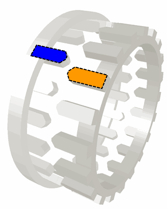 The Beveled Teeth Dog Clutch component models a dog clutch with beveled teeth. The component assumes identical teeth on both sides (see the following figure) and models the elastic contact with friction between teeth. The actuation is applied through a 1-D translational flange. The moving side travel is limited by an elastic end-stop.