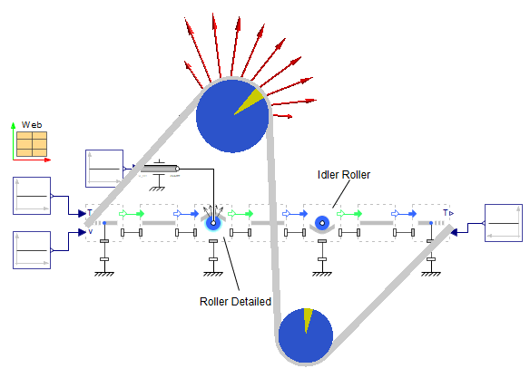 The Roller component must be between two Span components. Using the provided 1D rotational flange (flange_c), the Roller component models a pull roller. Without any applied torque or setpoint velocity, the Roller models an idler roller.