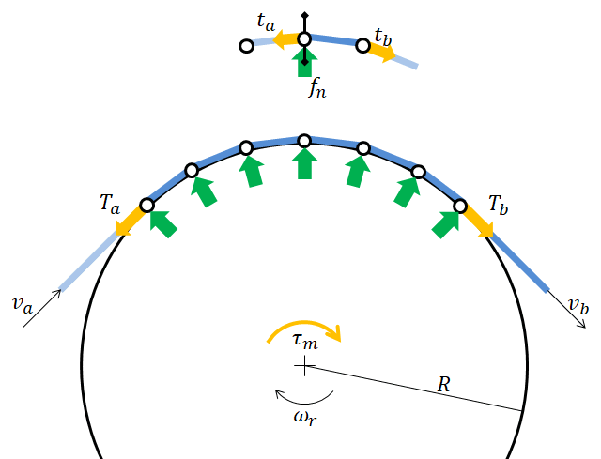 The Roller Detailed component uses a series of spans internally to capture the changing nature of the web/roller interaction over the contact arc. Each span is subjected to friction on its nodes which are calculated from the span tension resultant fn and the coefficient of friction.