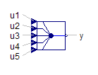The 5-port Multiplex component combines the input signals, u1, u2, u3, u4 and u5, in an output signal, y.