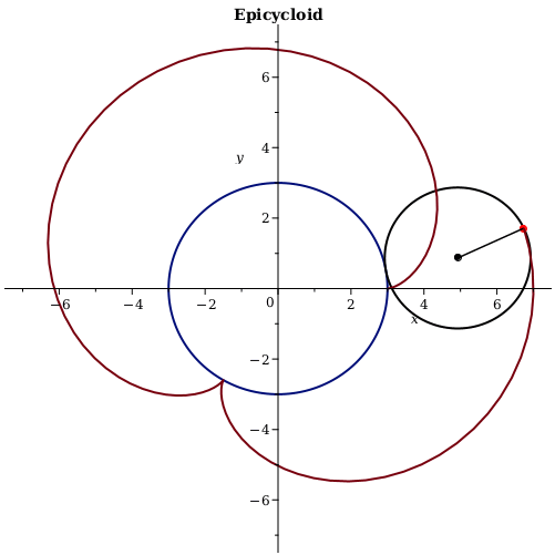 An epicycloid is a plane curve created by tracing a chosen point on the edge of a circle of radius r rolling on the outside of a circle of radius R. A hypocycloid is obtained similarly except that the circle of radius r rolls on the inside of the circle of radius R.