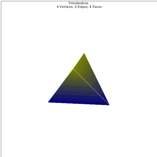 In honor of Plato, polyhedra satisfying the above condition are known as Platonic Solids. There are only 5 Platonic solids and Plato even proposed that the ancient elements (earth, air fire, water) were made of these mathematically perfect solids. He suggested that fire was made of tetrahedrons (4 faces), Earth was made of cubes (6 faces), air was made of octahedrons (8 faces), an lastly water was made of icosahedrons (20 faces). He postulated that the remaining solid, the 12 faced dodecahedron, was representative of the Universe as a whole.