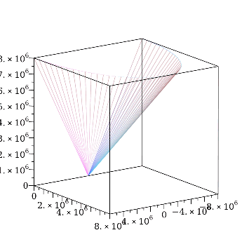 plot3d⁡r⁢cos⁡θ,r=0..10,θ=0..2⁢π,coords=cylindrical,orientation=100,71