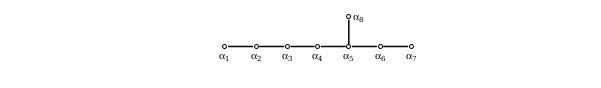 The Dynkin diagram is a graphic means of describing abstract root systems or, equivalently, of characterizing Cartan matrices. The command DynkinDiagram plots the Dynkin diagram for each root type Am , Bm , Cm , Dm , E6 , E7 , E8 , F4 , G2 .