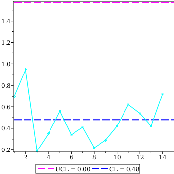 The MRChart command generates control chart for the moving range (MR chart) for the specified observations. The chart also contains the upper control limit (UCL), the lower control limit (LCL), and the average of the moving ranges of two observations (represented by the center line) of the underlying quality characteristic. Unless explicitly given, the control limits are computed based on the data.
