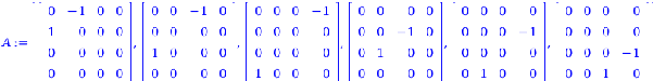 In this example we calculate the codifferentials for some multi-vectors defined on a Lie algebra with coefficients in a representation. For this example we shall use the Lie algebra so4and its standard 4-dimensional representation. To create the computational environment we use the commands SimpleLieAlgebraData, StandardRepresentation and Representation.