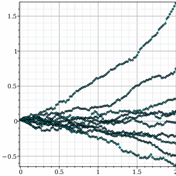 PathPlot⁡Y⁡t,t=0..2,timesteps=100,replications=10,axes=BOXED,gridlines=true