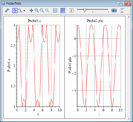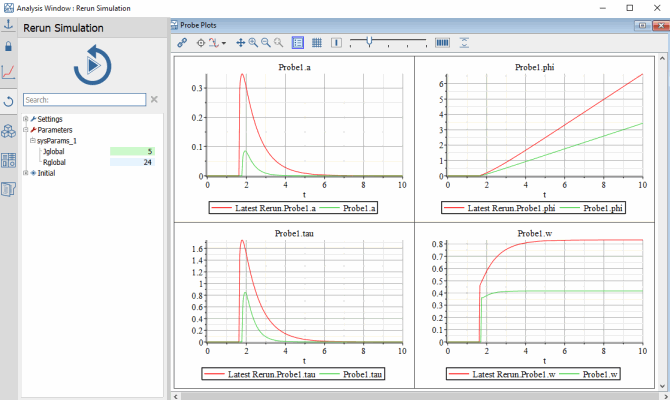 To include the angle (phi), speed (w), acceleration (a), and torque (tau) values in the simulation graphs, in the Properties tab ( ), select Angle, Angular Velocity, Angular Acceleration, and Torque.