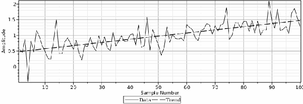 plots:-displaySignalPlotsignal_data,legend=Data,plotLinearFita+bx,seq1..100,signal_data,x,x=1..100,color=Black,legend=Trend,linestyle=dash