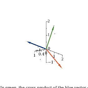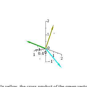 CrossProductPlot⁡1,−1,12,0,2,−1,vectorcolors=green,cyan,yellow