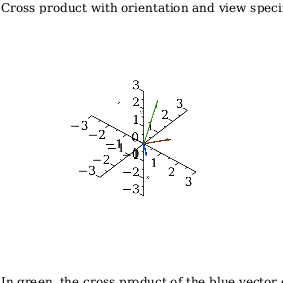 CrossProductPlot⁡1,−1,12,0,2,−1,orientation=−50,50,title=Cross product with orientation and view specified,view=−3..3,−3..3,−3..3