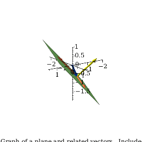 normal vector: <.8944, 1.342, .4472> equation of plane: .8944*x+1.342*y+.4472*z = 0. point on plane nearest origin: <0., 0., 0.> basis vectors: <1., -1., 1.>, <1., 0., -2.>
