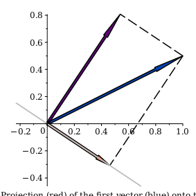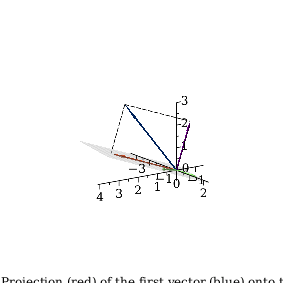 By default, the plot displays the vector being projected, the line or plane onto which it is being projected, the projected vector, and the projection onto the orthogonal complement of the projection line or plane. Furthermore, dashed lines from the head of the input vector to the heads of its projections onto the line or plane and its projection onto the corresponding orthogonal complement are drawn. Using various show... options you can suppress these components and optionally request that the vector or vectors used to define the projection line or plane be shown.