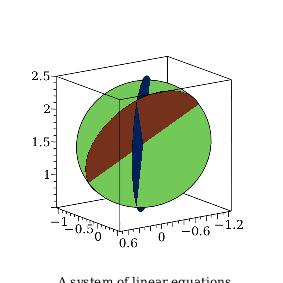 In three dimensions, the solution to the system may not be apparent from the first presentation of the plot. However, by clicking on the plot and dragging with the mouse, you can manipulate the plot to get a better view. In the default presentation of the following system, one of the planes may appear as a line. Drag the plot to see all 3 planes and their common point of intersection more clearly.