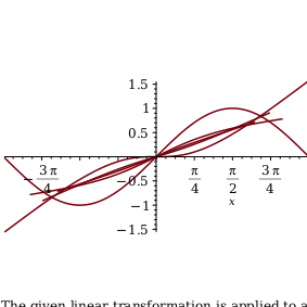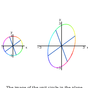 The Student[LinearAlgebra] subpackage provides two commands that can be used to visualize the action of a linear transformation. The first, LinearTransformPlot, displays domain and range objects in a single plot. The domain object is a line segment, circle, or sphere, as determined by the column dimension of the matrix, while the range object is the image of the domain object under the action of that matrix.