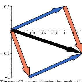 The VectorSumPlot command displays the sum of a collection of vectors. The sum is displayed graphically by connecting the head of each vector in the collection to the tail of another vector in the collection. As there are many ways to form these connections, the routine by default displays all connections, effectively producing a lattice whose edges can be followed from the origin to the point that corresponds to the sum. By default, the sum vector is drawn in black.