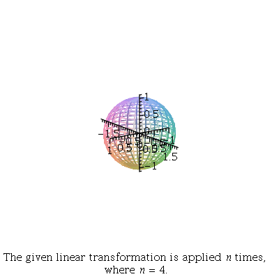 The second command, ApplyLinearTransformPlot, can be used to show the action of a given linear transformation as applied to different domain objects. These input objects can be any of a regular set of objects (circle, square, sphere, cube, or grid) or an arbitrary plot object. The default object is a circle in the 2-D case and a sphere in the 3-D case. Also, by default, 4 successive applications of the transformation are applied (where the input at each step after the first is the output from the previous step).