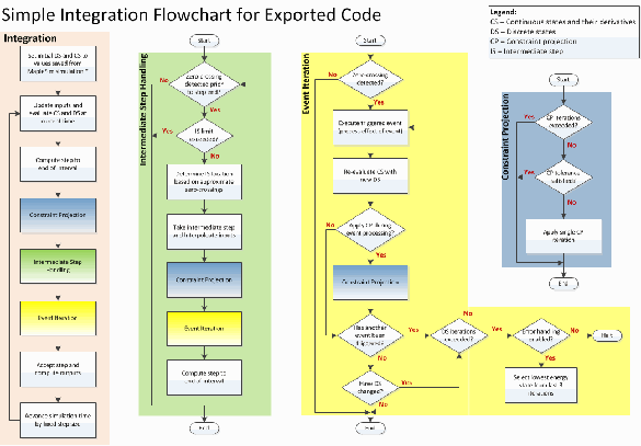 Event handling in MapleSim’s internal engine is a complicated process that involves a variety of heuristics and algorithms.  A simplified version of this event handling is embedded in MapleSim’s exported C code and is shown in the box labeled "Event Iteration" in Figure 4.
