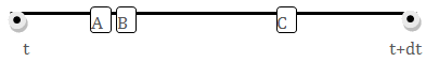 If intermediate steps are not used, events A, B, and C will be processed at t+dt (the end of the step).  However, with intermediate steps, the exported code will take an internal step at the approximate time of event A.  If event B is close enough to event A (within the tolerance specified by the option), the internal step will instead be taken at the approximate time of event B.  After completing the event iteration for this internal step, the algorithm will again check if there are any remaining events before t+dt.